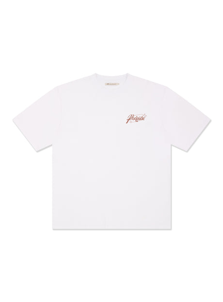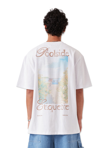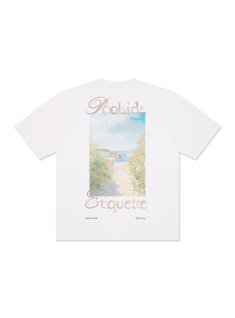The Beachside Tee in White featuring large digital print on back, accented with logo puff prints. Tee shirt has thicker neckline and is on 260g heavyweight cotton.