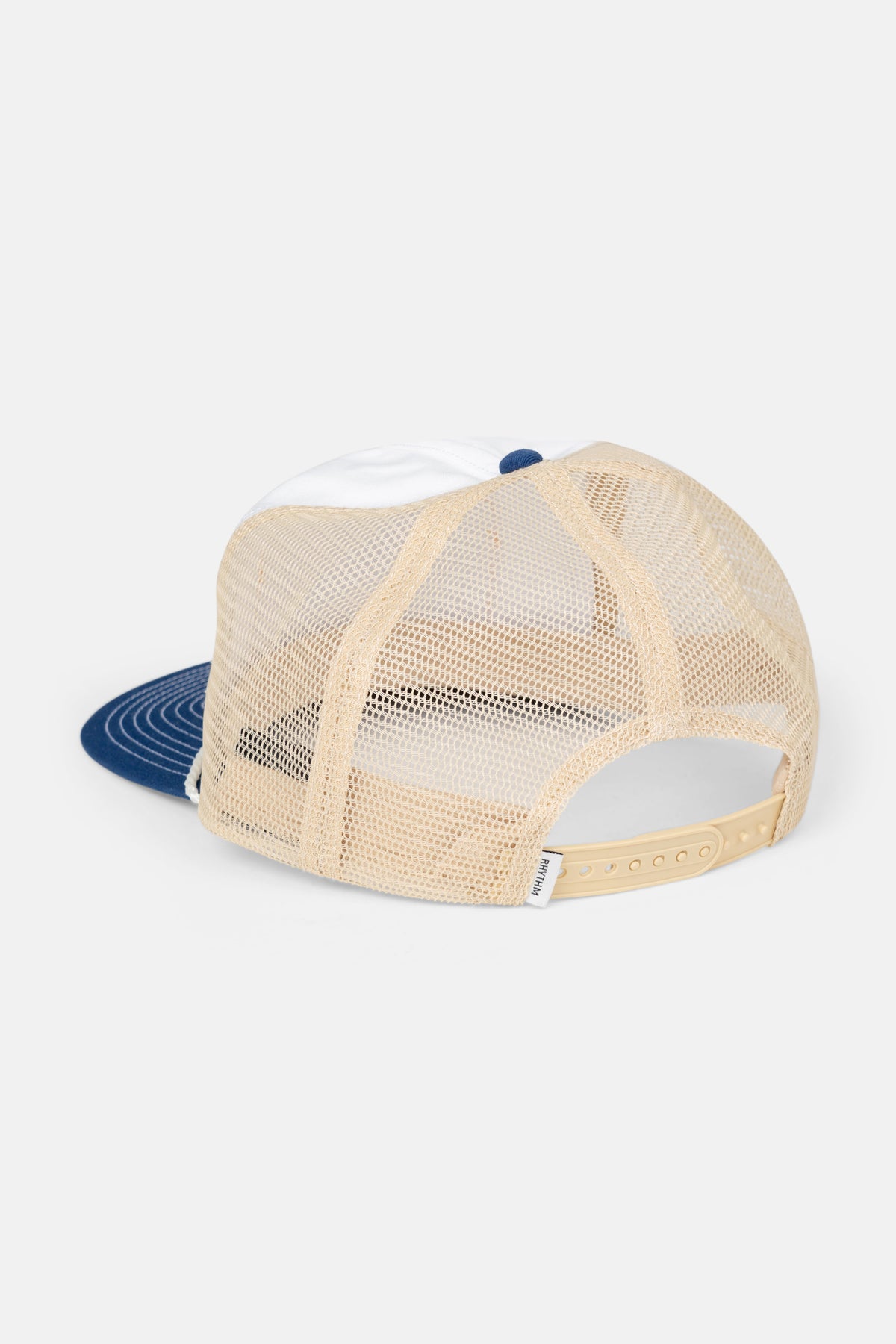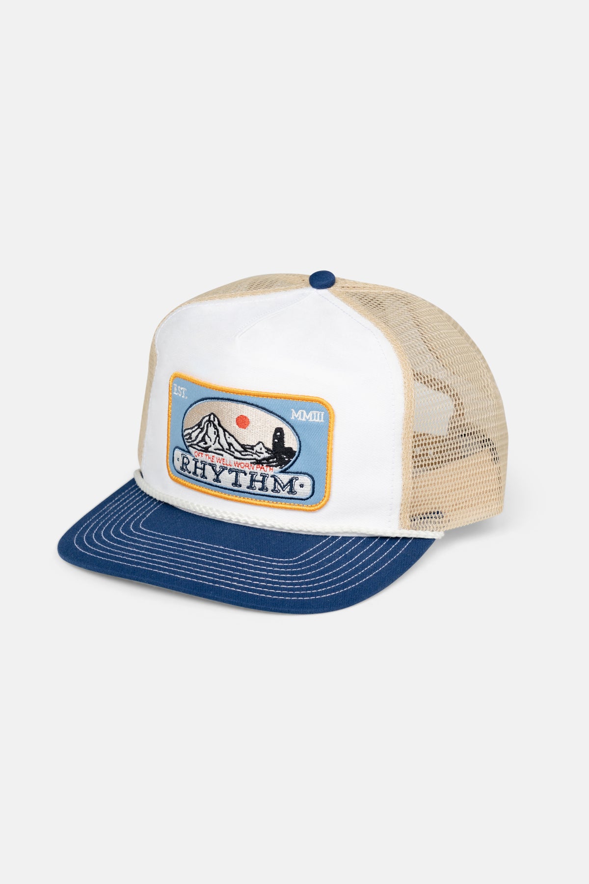 A classic trucker cap with contrast details. Features an embroidered patch appliqué, mesh back, and a rope detail on the peak for a timeless surf aesthetic. Adjustable snap-back closure ensures a perfect fit.