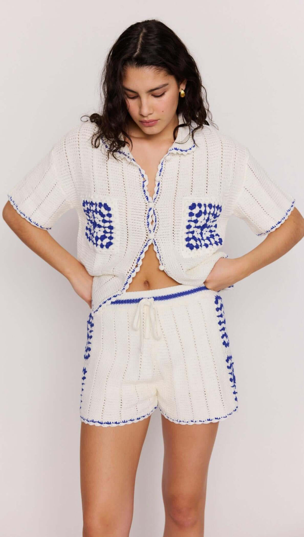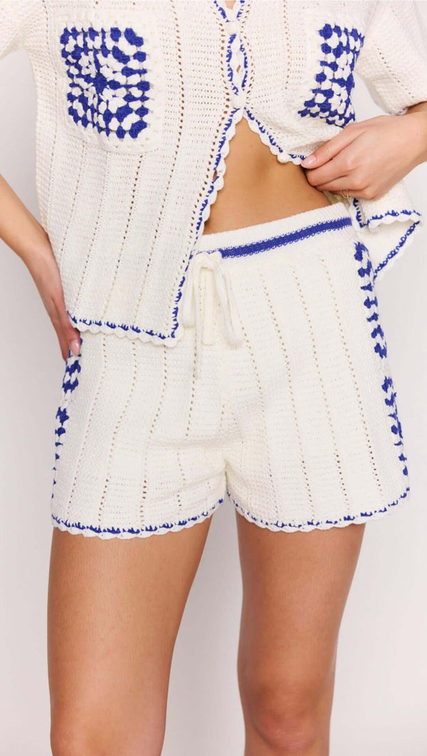 Your new off-duty favourite. These Avalon Blue & White Cotton Crochet Knit Shorts feature a comfortable elastic waist with drawstring tie and a relaxed fit that’s made for warm-weather days. Designed to pair perfectly with the Avalon Crochet Shirt or styled solo for effortless summer cool.