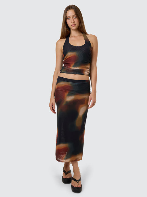 Fitted, fiery, and ready for a night out, the Metamorphic Daze Halter Top in Black brings a bold, fluid abstract print and sleek cut together in one statement piece. Made from soft-stretch fabric with a luxe sheen, it features a flattering halter neckline, exposed shoulders, and a cropped length that pairs perfectly with our matching Metamorphic Daze Slip Skirt. This tank top from our Australian women's clothing spring collection is an elevated alternative to basic women's fashion tees, adding colour and shape to your street style.
