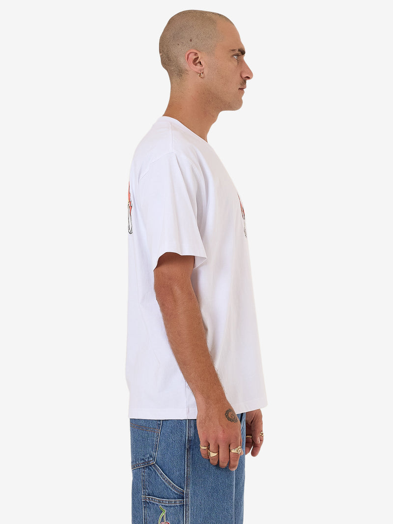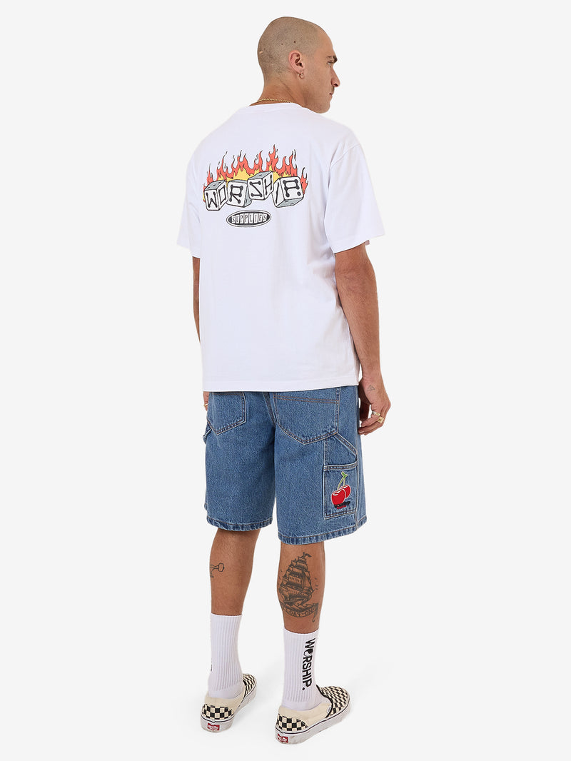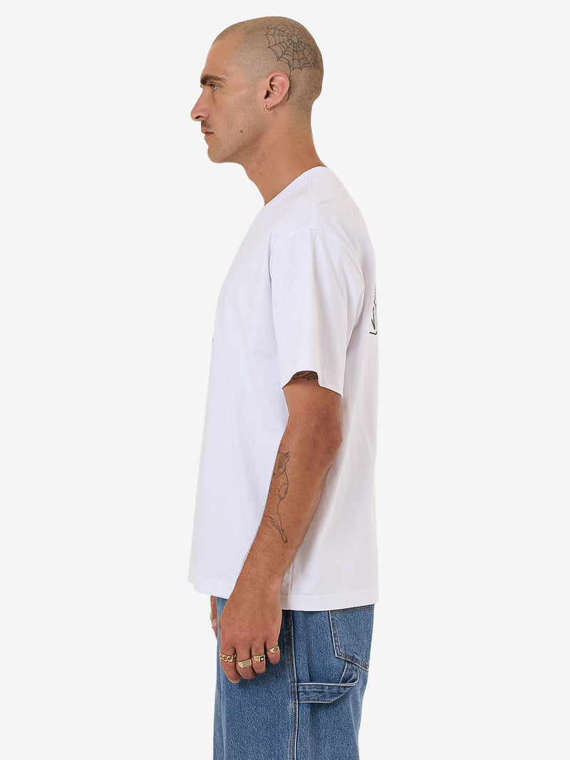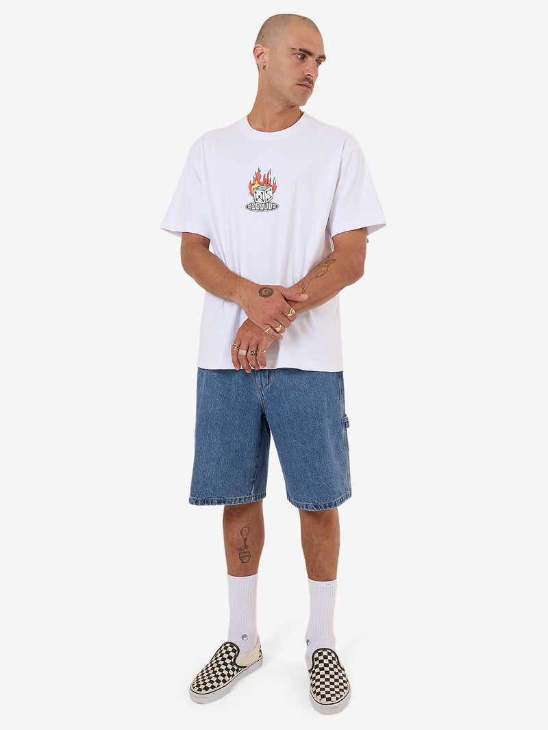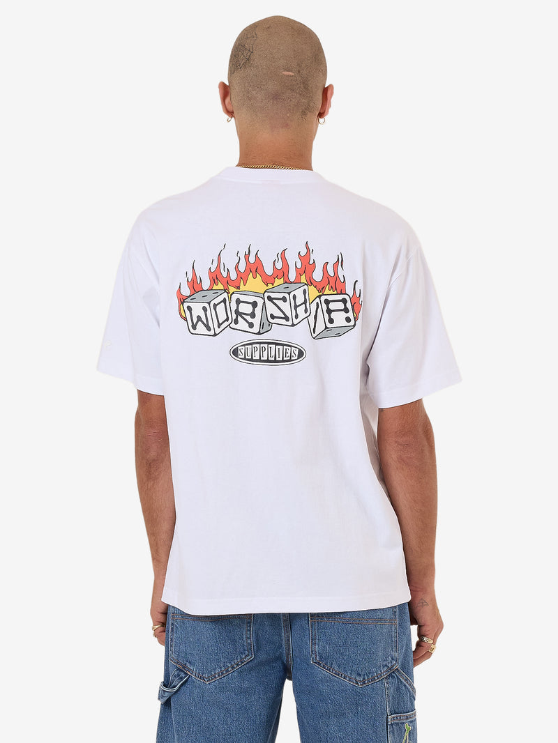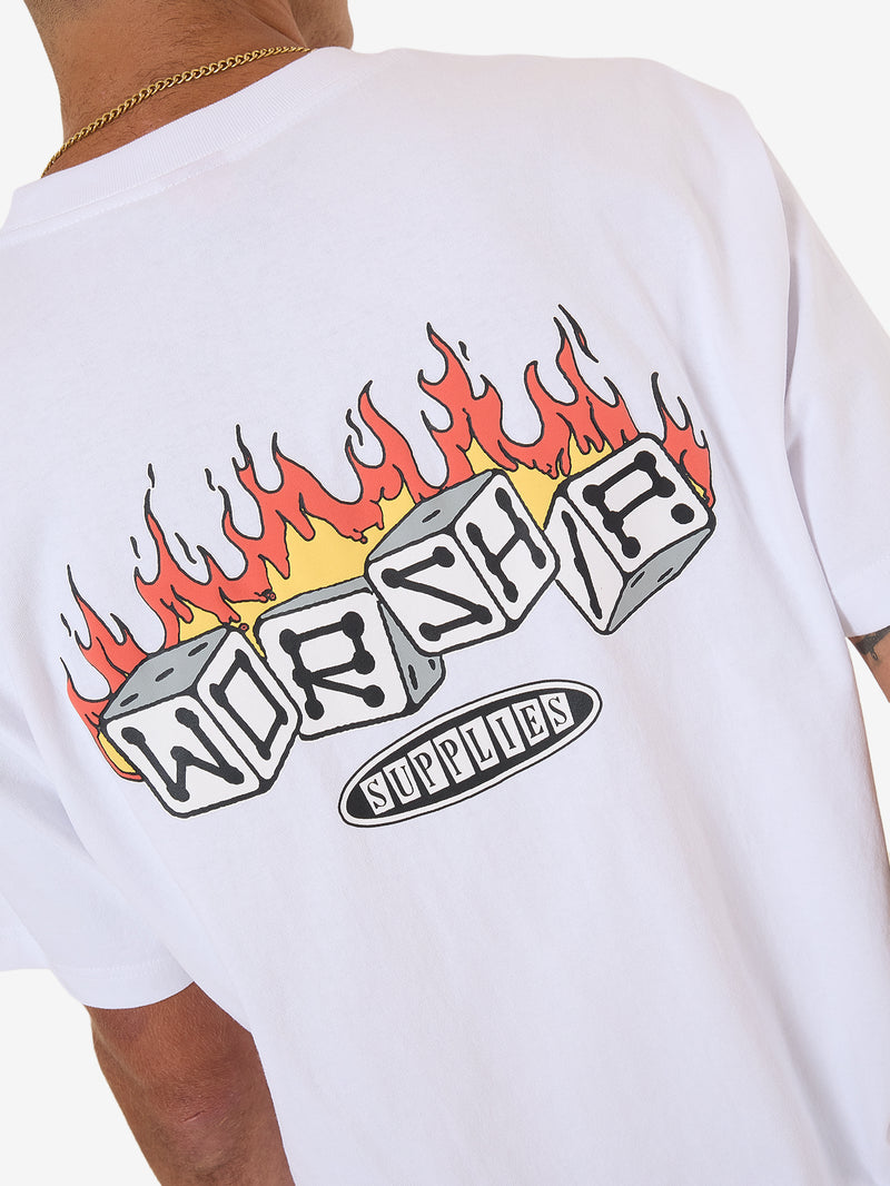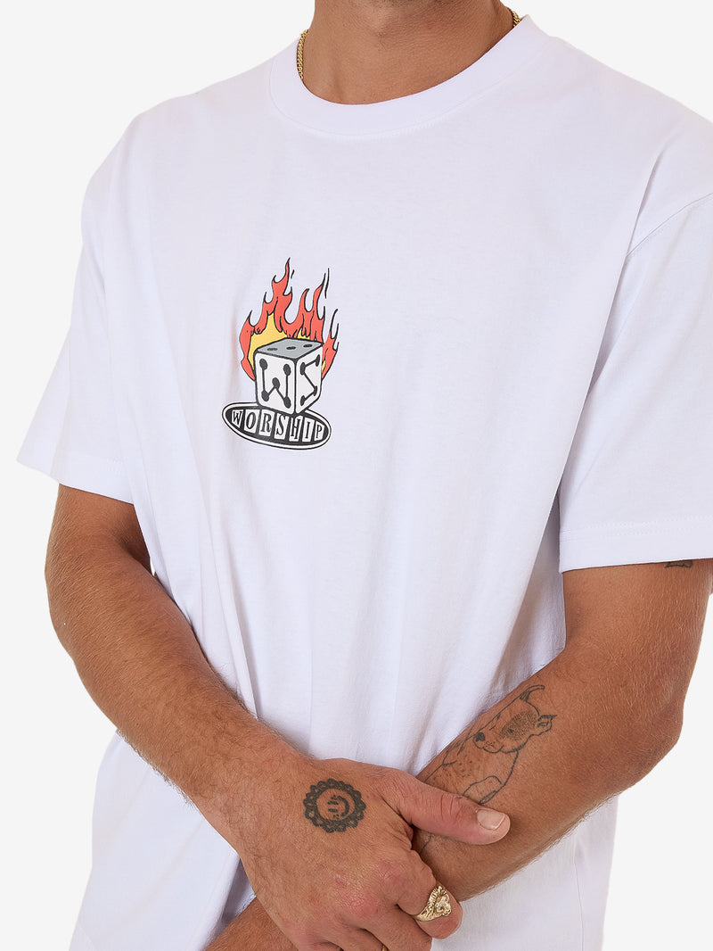 • The Snake Eyes Tee in White goes big with bold snake flame visuals and classic streetwear shape. Designed for everyday comfort and style, this men's white tee features a roomy fit and a classic crew neckline in a heavyweight cotton jersey construction. This men's streetwear is clean, breathable, and elevated with contrast front and back graphics for a full-on retro vibe.