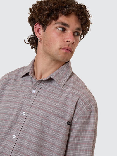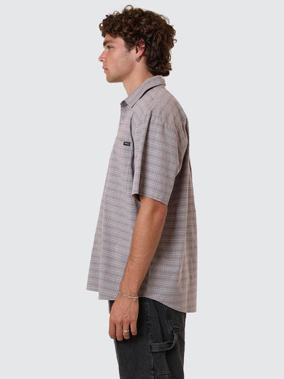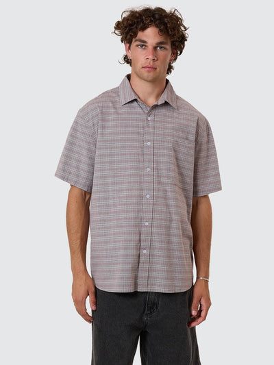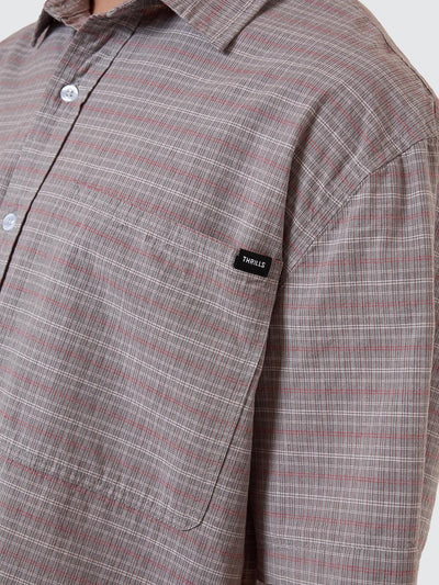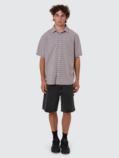 Checks, stripes, earthy tones, this Minimal Thrills Stripe Check Short Sleeve Shirt in Smog keeps it subtle but sharp. Crafted from premium cotton yarn dye plaid, itÕs a no-fuss men's short sleeve shirt with a soft texture and boxy silhouette made for layering or solo wear. This is a low-key casual button up shirt that works with casual cotton shorts, vintage denim shorts, or even men's pants if you want to dress up. Streetwise yet timeless, this relaxed fit shirt is plaid perfection.
