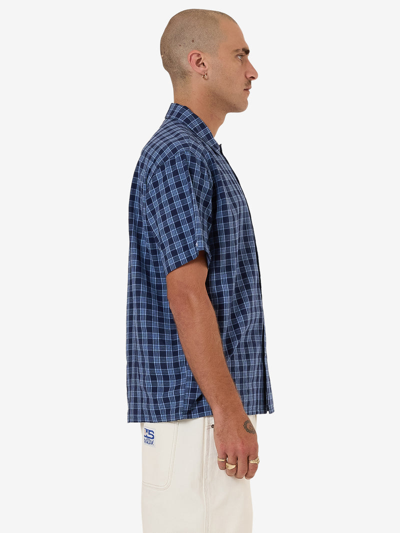 • Offering a blend of boxy fit and a clean check, the Removal Short Sleeve Shirt in Bell Air Blue keeps it classic with a streetwear spin. Made from cotton yarn dye, this button-up shirt delivers a lightweight and breathable finish in a relaxed, short-sleeved cut. Designed with a stitched patch detail on the chest, this Worship Supplies streetwear drop is made for easy layering over tank tops or wearing solo with men's work pants.