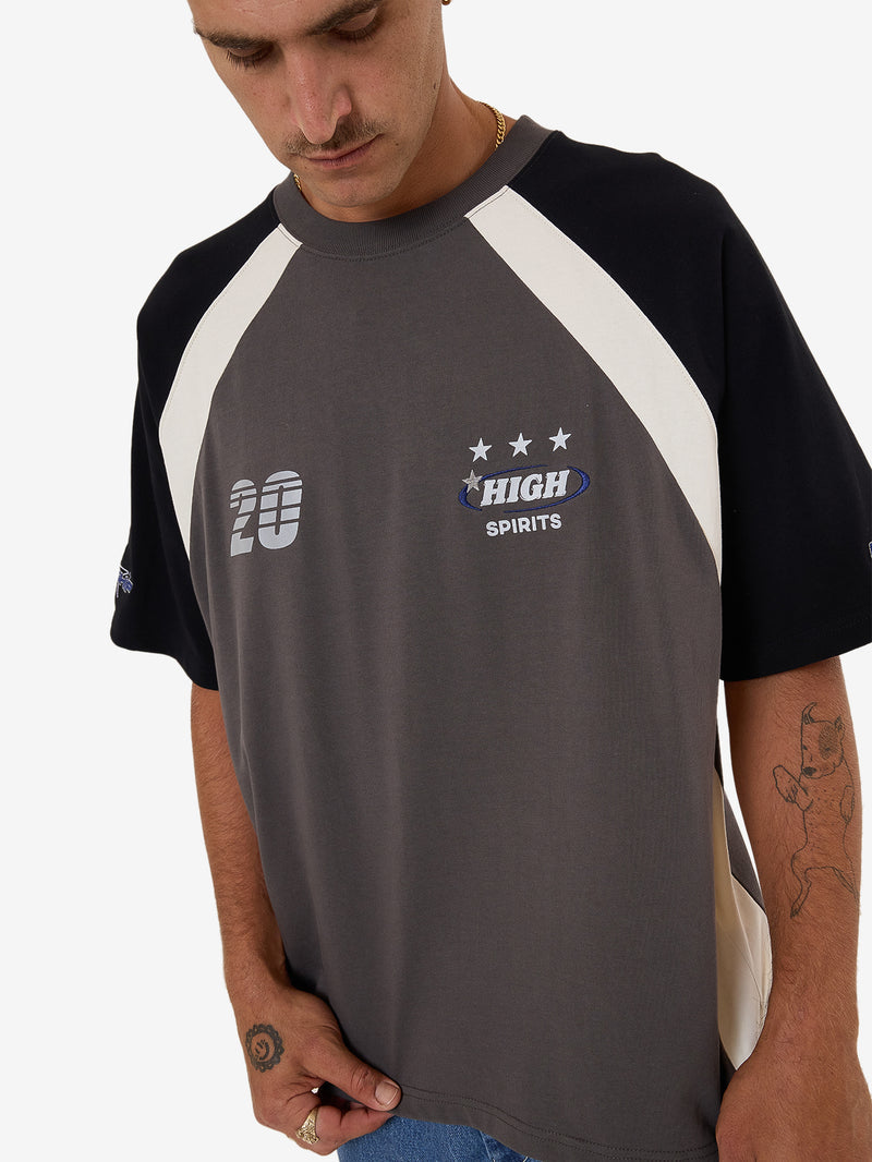 • The Shooter Oversize Raglan Tee in Zine delivers a two-tone, retro aesthetic in a slouchy, oversized fit. Loaded with front hits and a stacked back typography, this oversized men's tee is sporty and edgy, featuring a loose, relaxed fit with contrast raglan sleeves. Made from heavyweight cotton jersey, itÕs soft yet structured, and built to hang loose.
