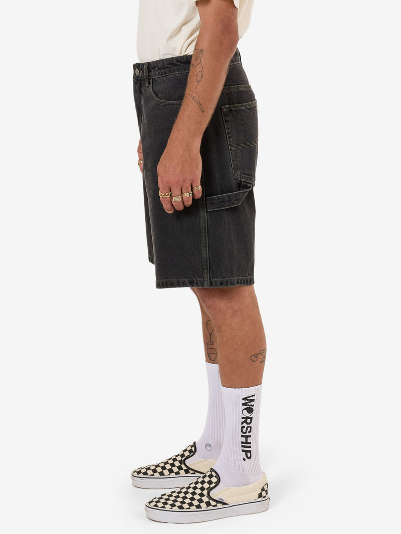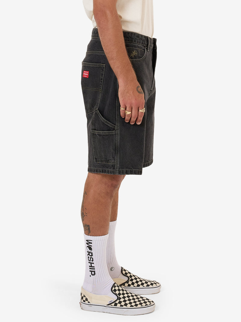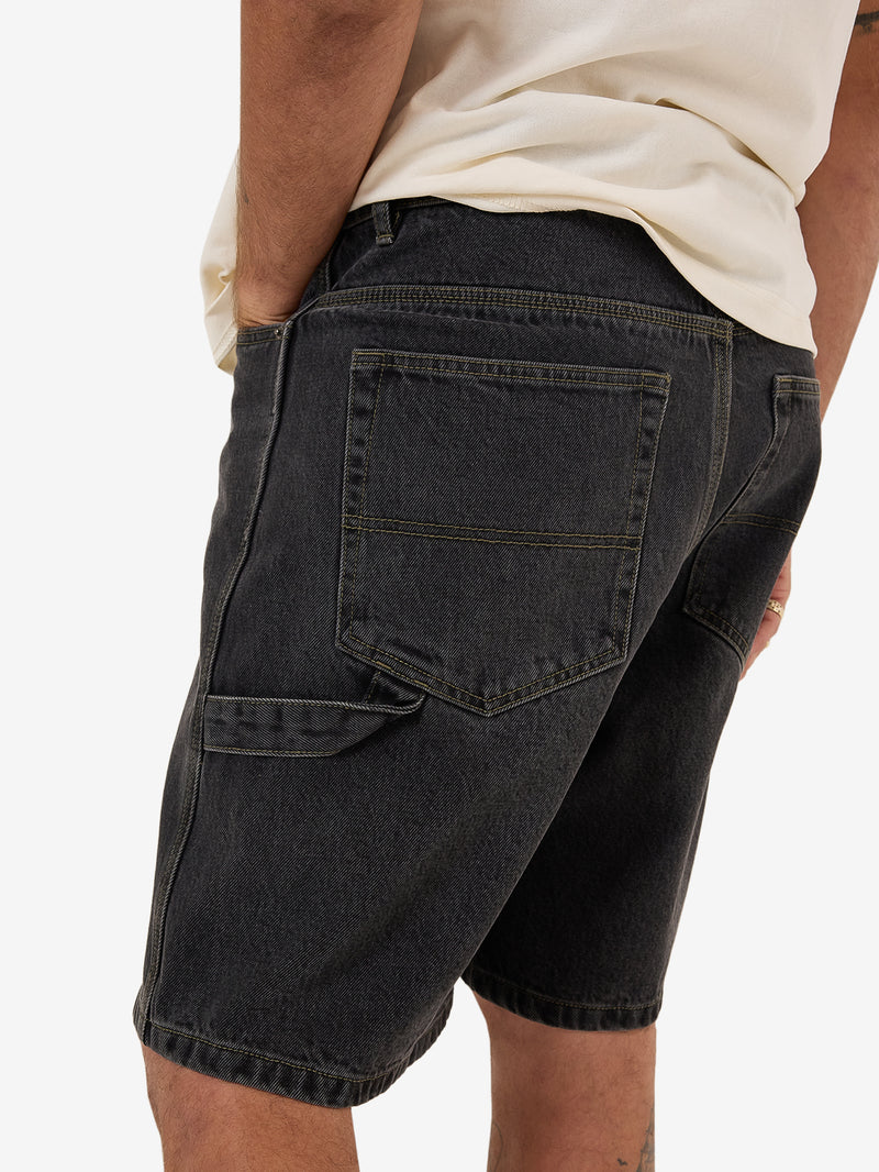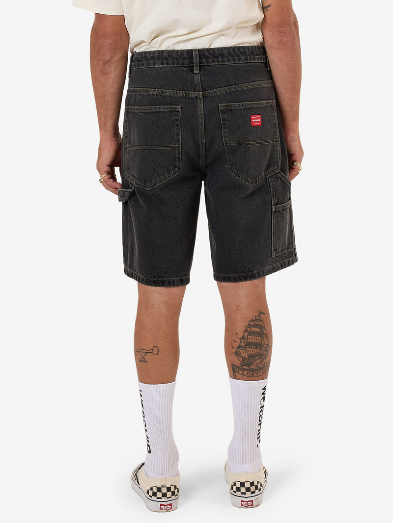 • Workwear roots with a streetwear finish, the Carpenter Jean Short in Phantom offers utility energy and durability with a clean black wash. Cut from heavyweight cotton denim, these men's shorts are relaxed through the leg with stacked pockets, a wide hem, and a subtle logo hit to finish things off. Washed down and ready to go, this streetwear staple wears easily with everything from work shirts to tank tops and oversized graphic tees.