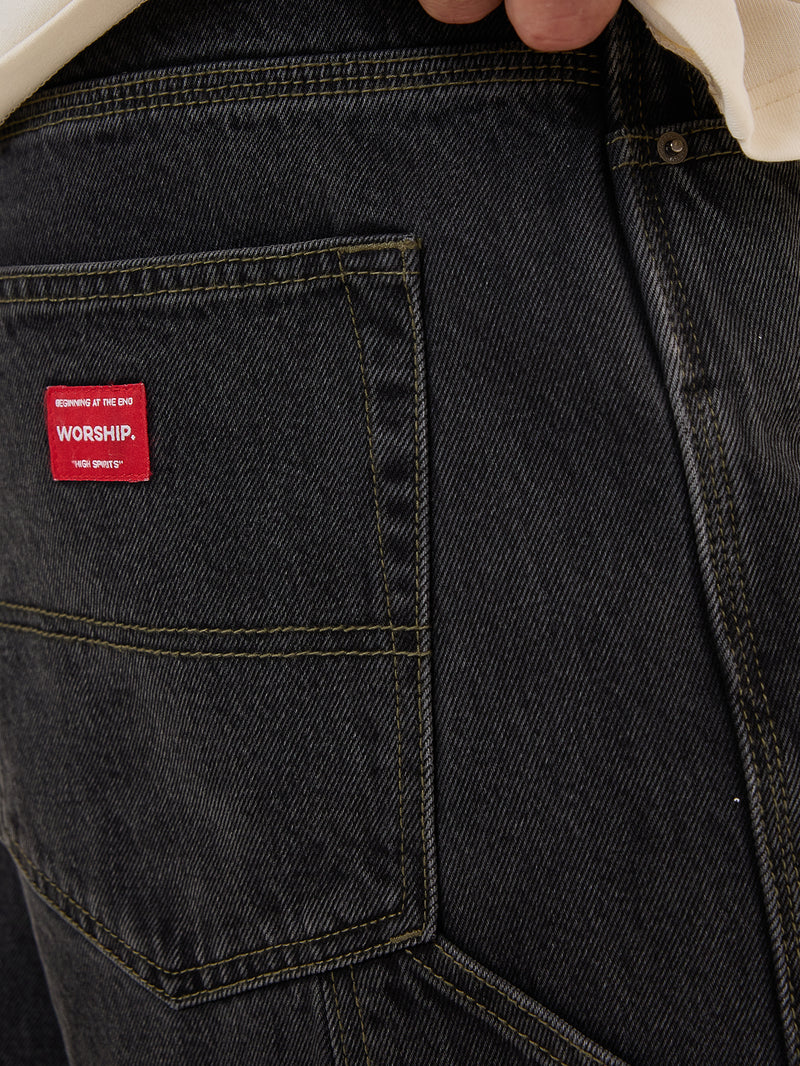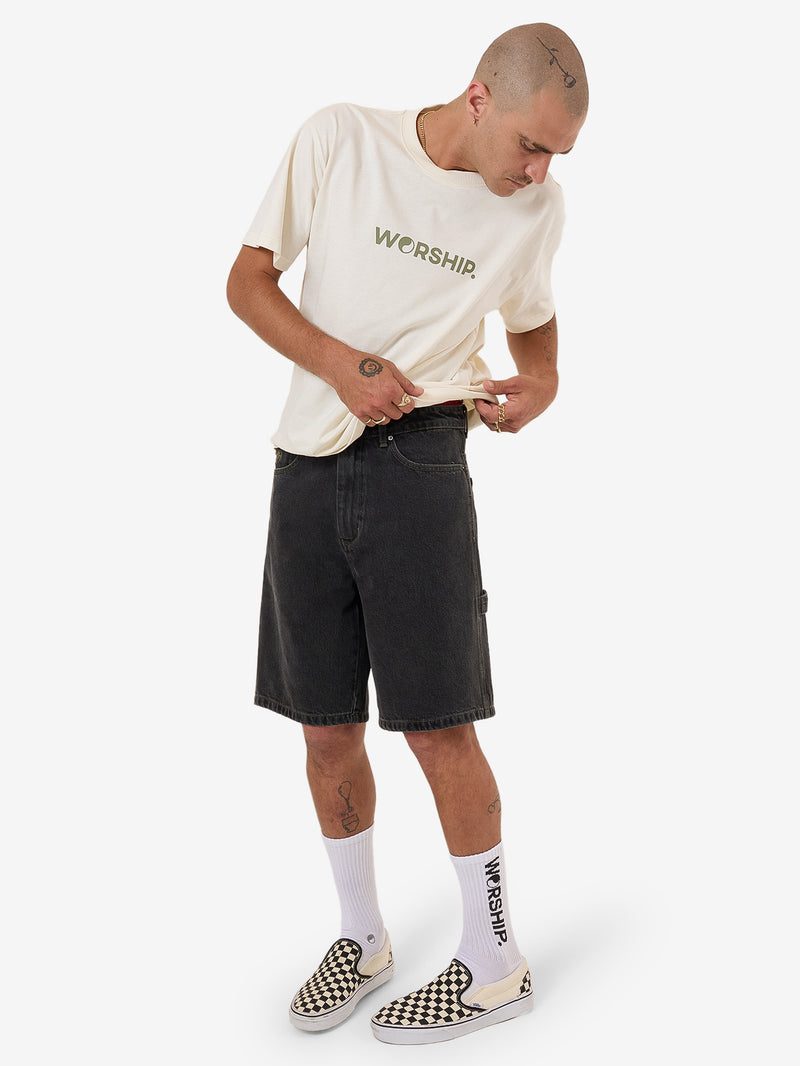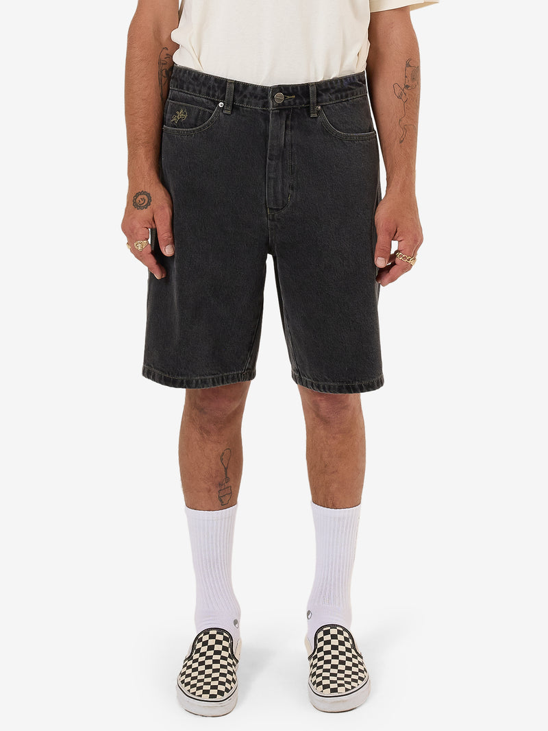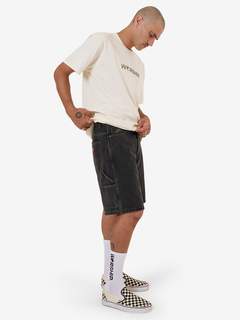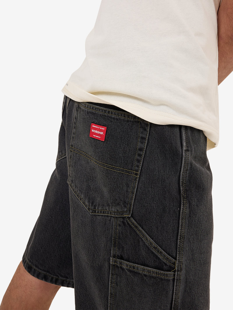 • Workwear roots with a streetwear finish, the Carpenter Jean Short in Phantom offers utility energy and durability with a clean black wash. Cut from heavyweight cotton denim, these men's shorts are relaxed through the leg with stacked pockets, a wide hem, and a subtle logo hit to finish things off. Washed down and ready to go, this streetwear staple wears easily with everything from work shirts to tank tops and oversized graphic tees.