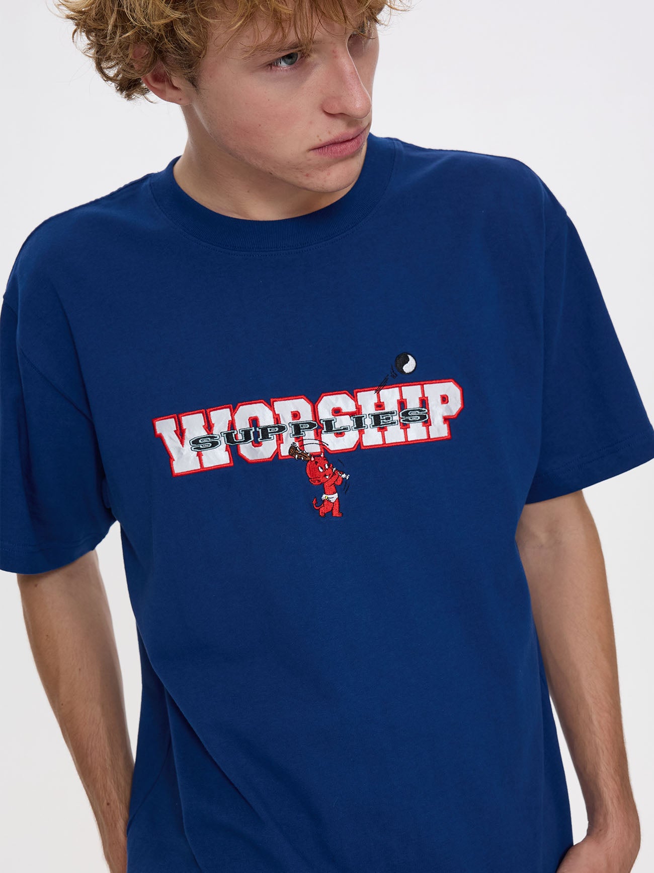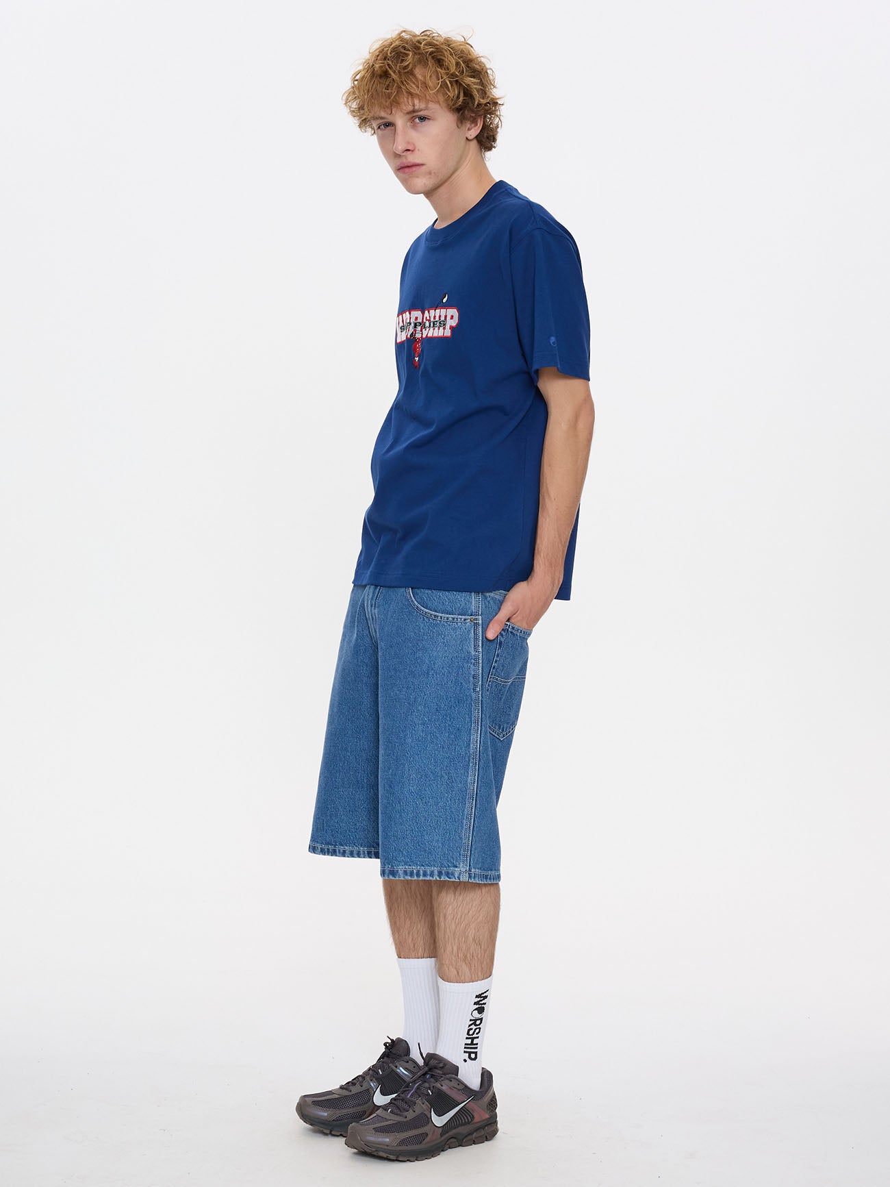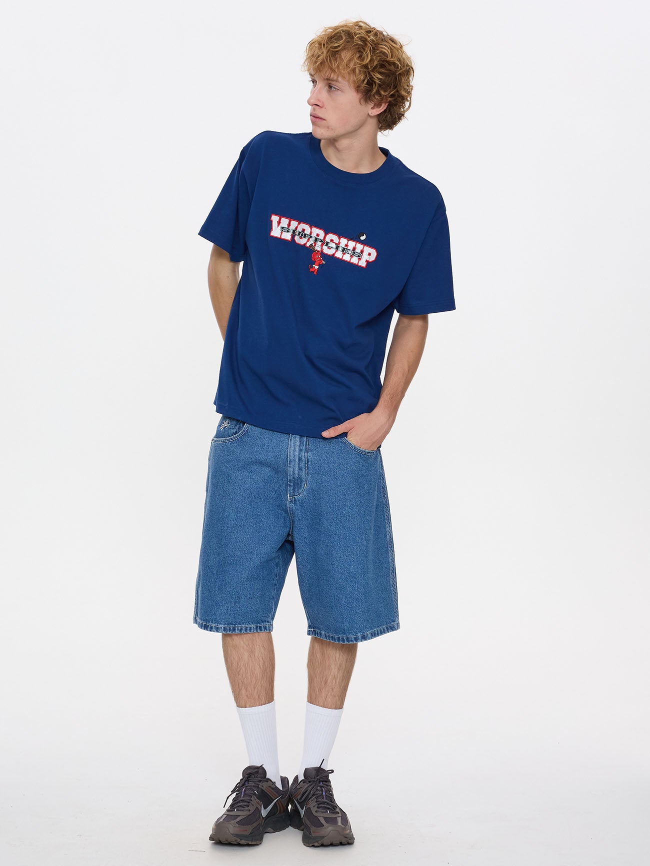 • The Belter Tee in Blue Depths goes bold with a Worship front logo, bringing vintage energy into a clean streetwear frame. Cut from 280gsm cotton jersey, this oversized tee Australia piece delivers a heavy-wearing, structured fit with a relaxed drape built for everyday wear. The deep blue base makes the graphic pop, giving it instant Y2K appeal while staying versatile in rotation. Pair it with baggy denim shorts or layered under an open streetwear t shirt Australia-style for a full street-ready look.