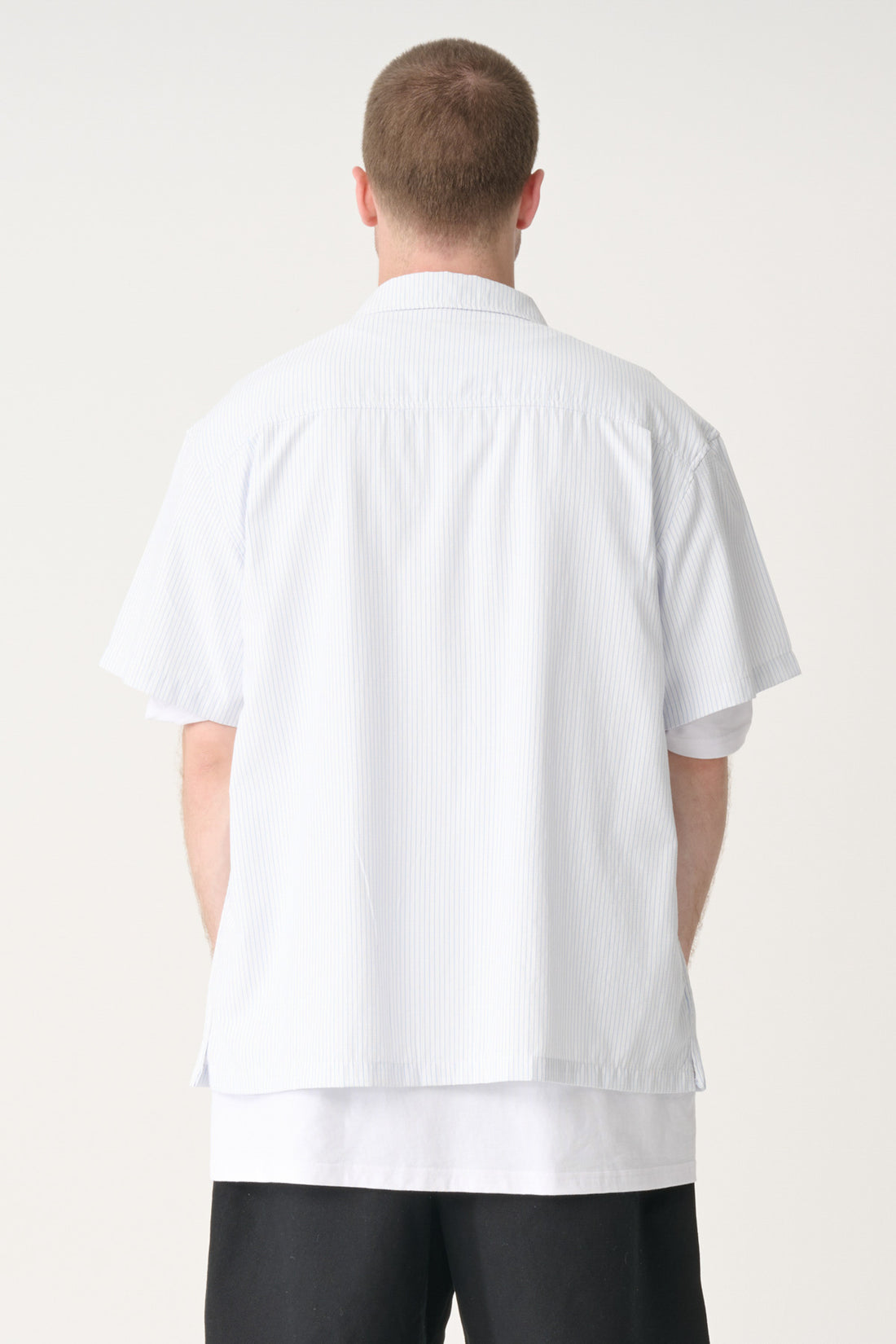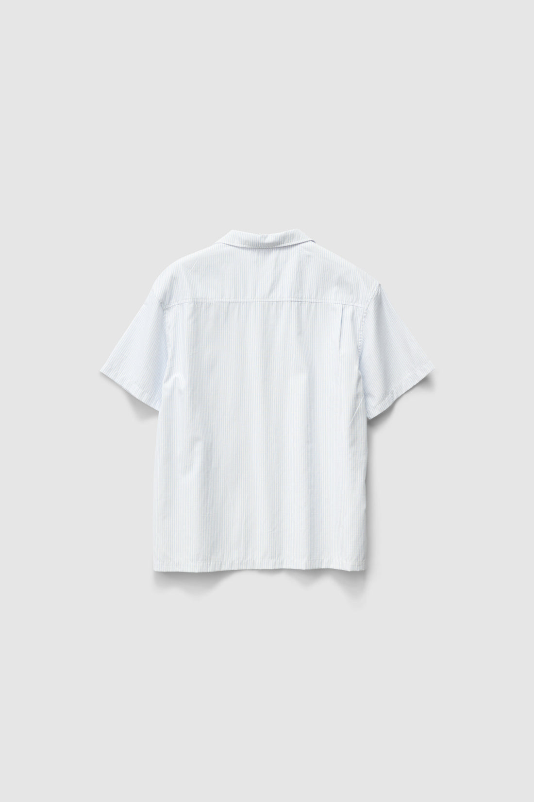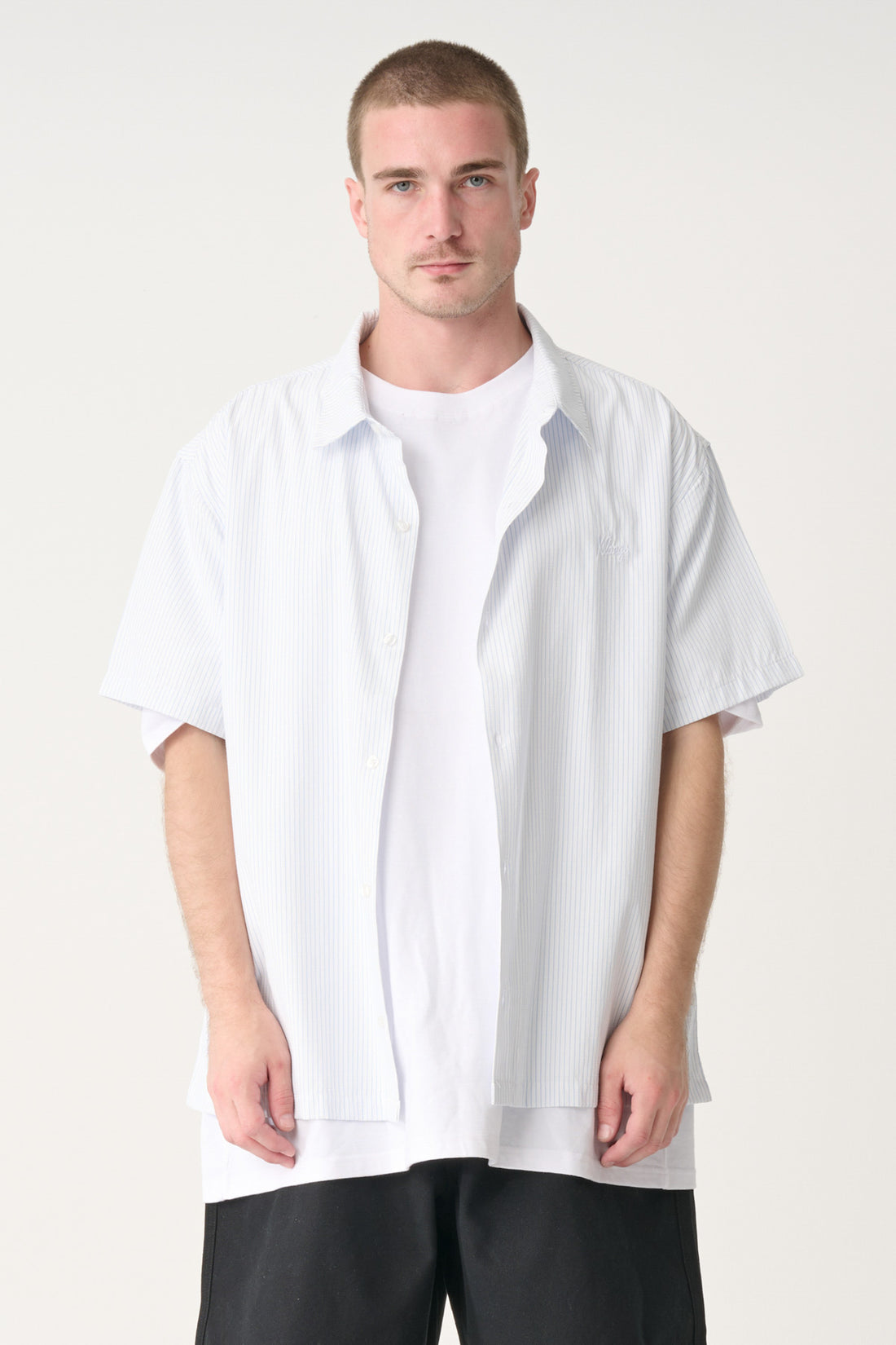 The Oxford Script SS Shirt in Dusty Navy Stripe is an oversized box-fit traditional short sleeve shirt.