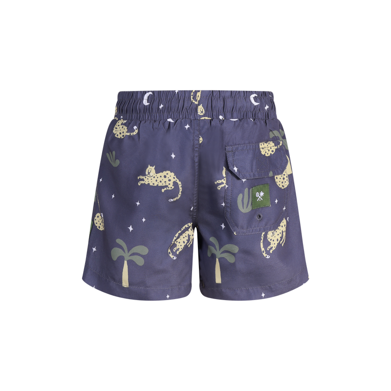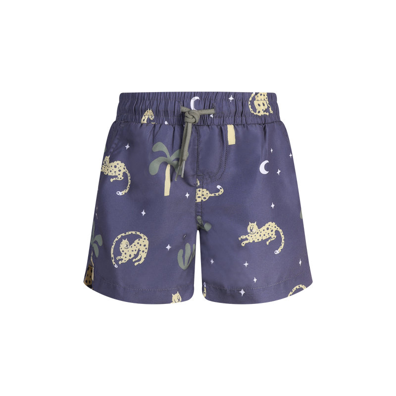 Make a splash with the Leopard Nights Boys Swim Shorts in Charcoal. Made from quick-drying recycled polyester with a supportive mesh brief, these shorts feature a fun hand-drawn leopard and palm tree print. With an elastic drawstring waist, Velcro back pocket with drain eyelet, side pockets, and a sewn-on patch logo, they're perfect for beach days, poolside fun, or sunny summer adventures.
