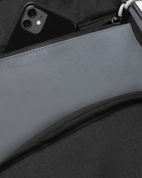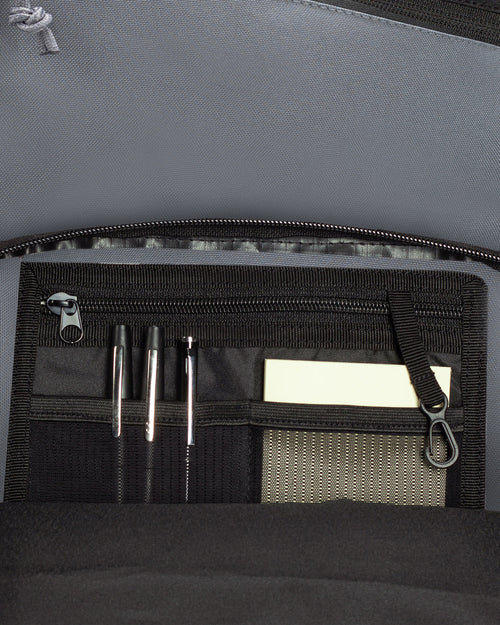 • Lower front zipper pocket w/ organizer and internal keyclip