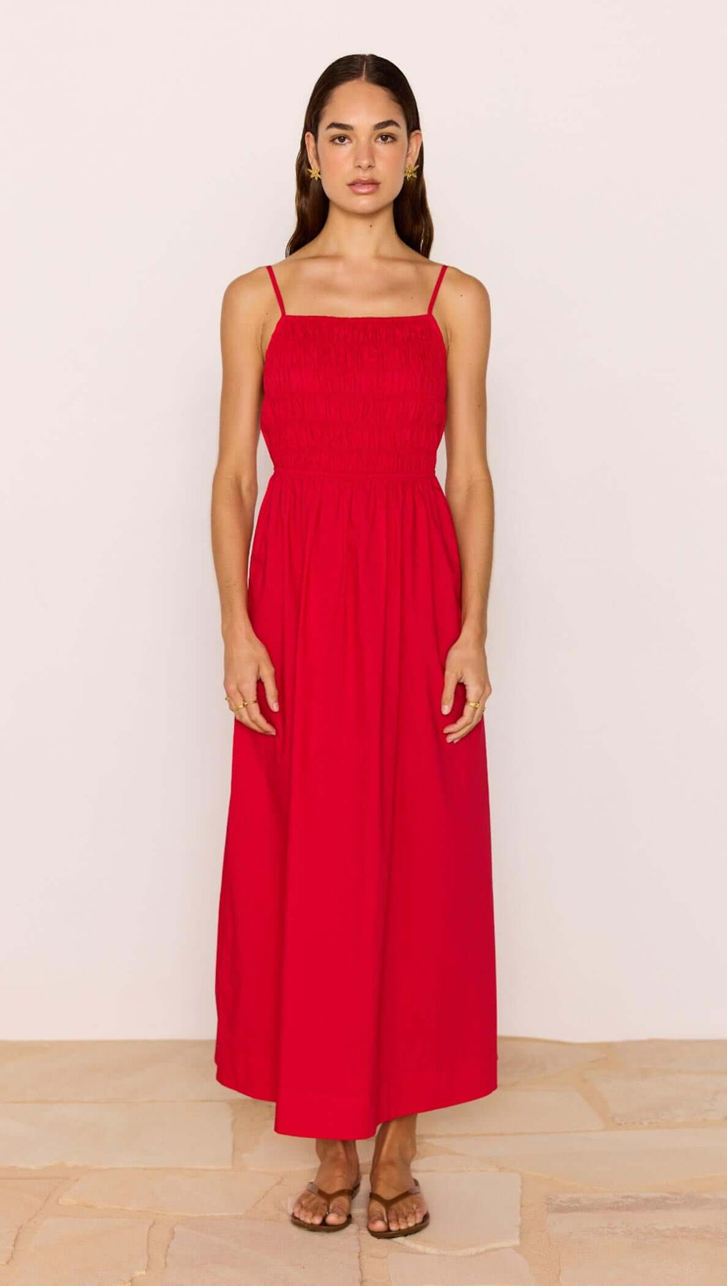 The Margot Red Cotton Linen Blend Tie-Back Maxi Dress is a breezy, statement style designed for effortless summer dressing. Made from a breathable cotton-linen blend, it features a shirred bodice for comfort and a flattering fit, while the flowing maxi skirt creates an elegant silhouette. Finished with an adjustable tie-back, this dress is perfect for relaxed weekends or warm evening occasions.